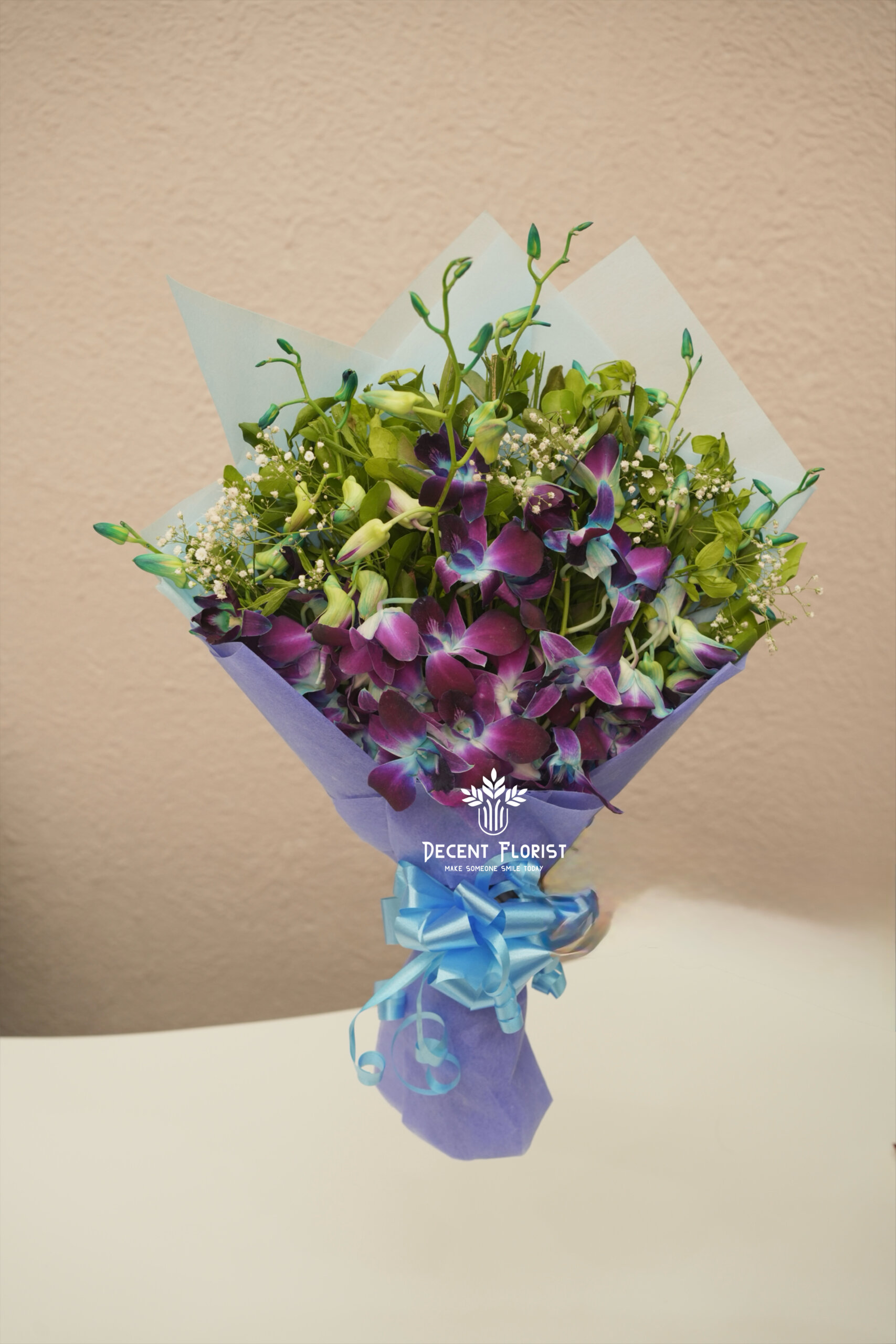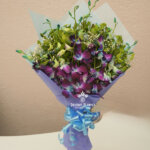 A stunning bouquet of 10 fresh orchid sticks beautifully arranged with delicate baby’s breath, wrapped in stylish purple or blue wrapping paper. This elegant arrangement creates a luxurious and graceful look, perfect for birthdays, anniversaries, celebrations, or special surprises.