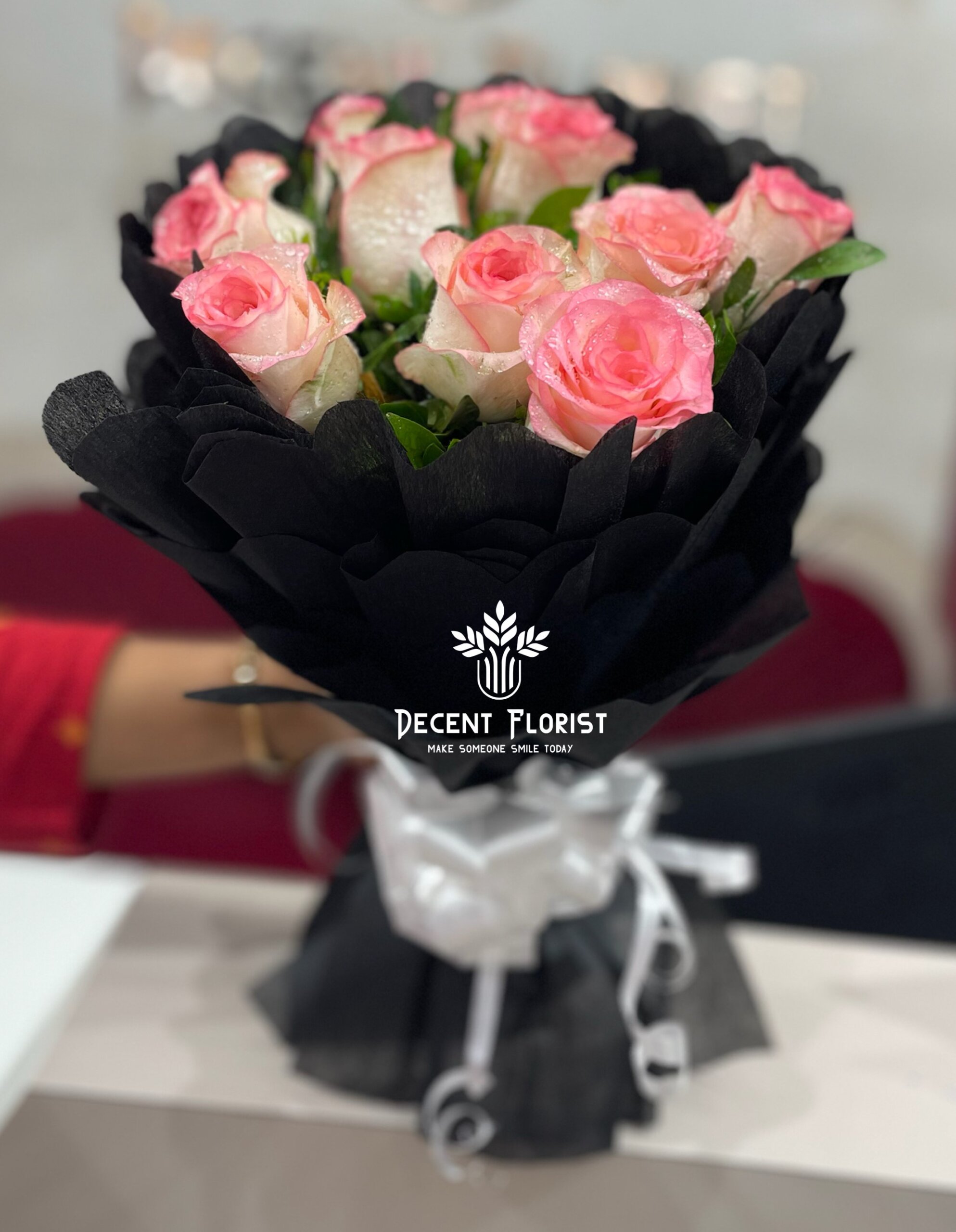 A beautiful hand bouquet crafted with 10 premium double-shade roses, carefully wrapped in elegant black paper to create a stylish and modern look. Perfect for expressing love, appreciation, or making any moment special.