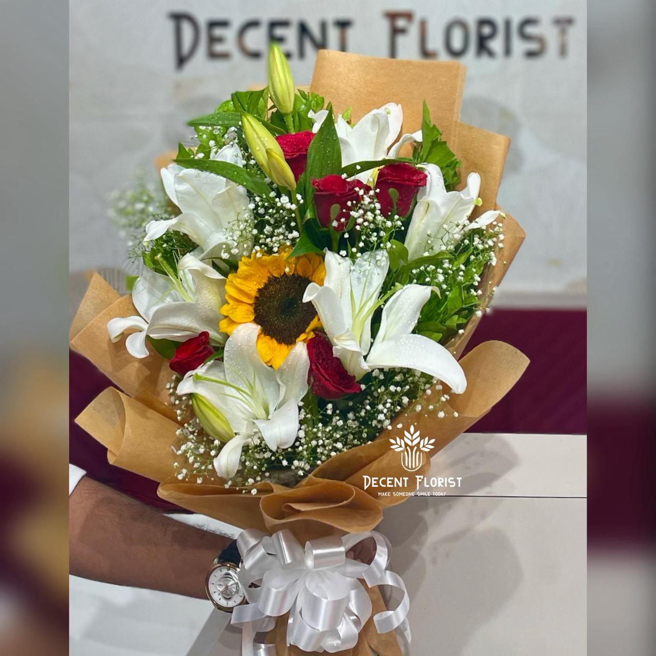 A radiant blend of 1 bright sunflower, 5 passionate red roses, and 3 elegant lily stems, delicately accented with soft baby’s breath. Wrapped in luxurious golden paper, this bouquet symbolizes love, happiness, and new beginnings — perfect for romantic surprises and special celebrations.