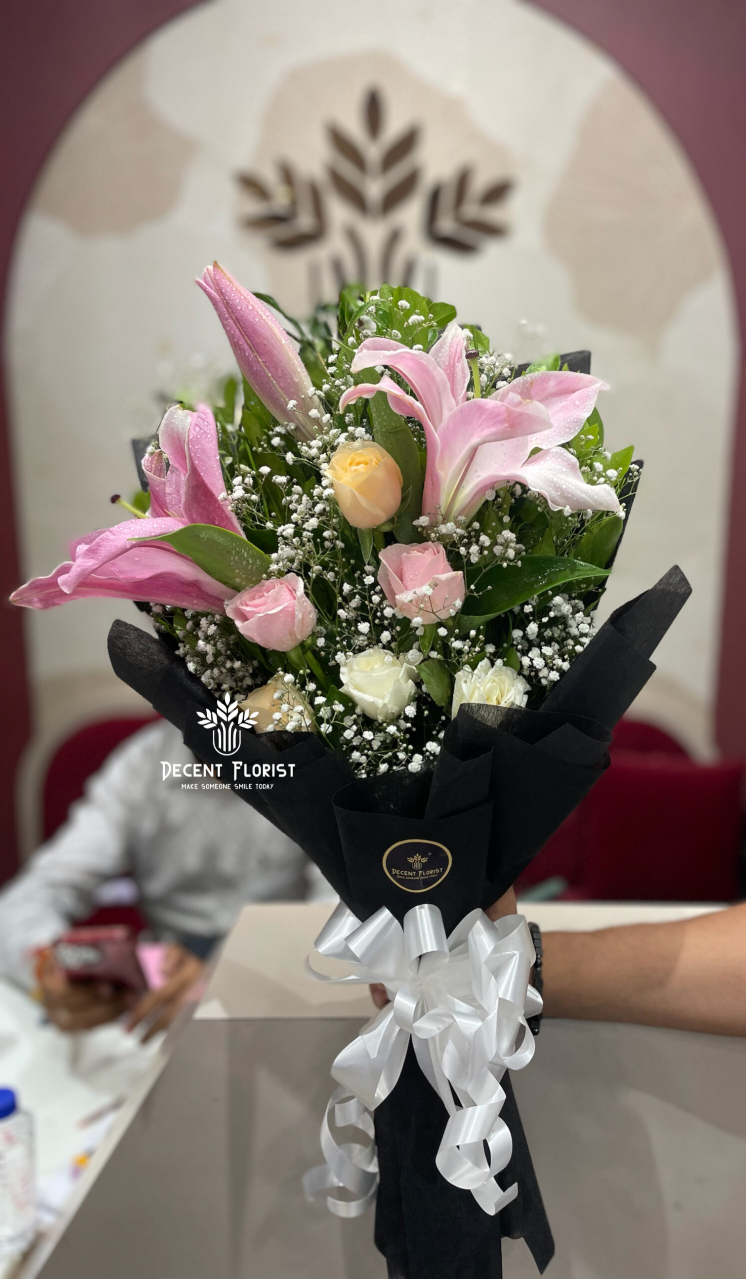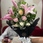 A stunning harmony of fragrant pink lilies 1 stick and fresh light pink rose 2 and white roses 2 and peach rose 2, enhanced with baby’s breath and wrap with black nonwoven for a soft, dreamy finish. This bouquet is perfect for anniversaries, engagements, or special occasions that deserve something beautiful.