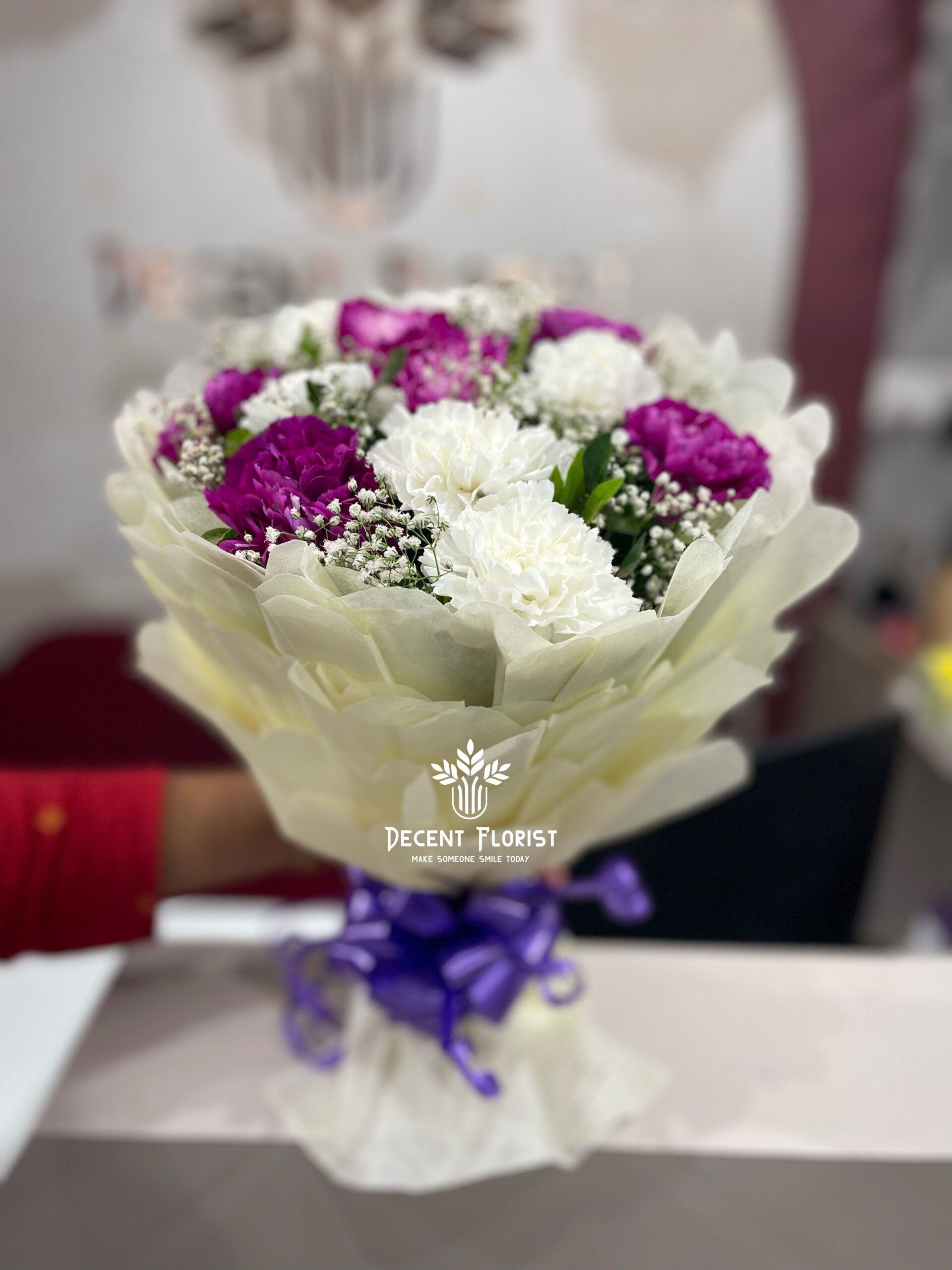 A graceful hand bouquet featuring fresh purple and white carnations, beautifully arranged and wrapped in elegant off-white paper. This charming bouquet symbolizes admiration and purity, making it a perfect gift for birthdays, anniversaries, or special moments.