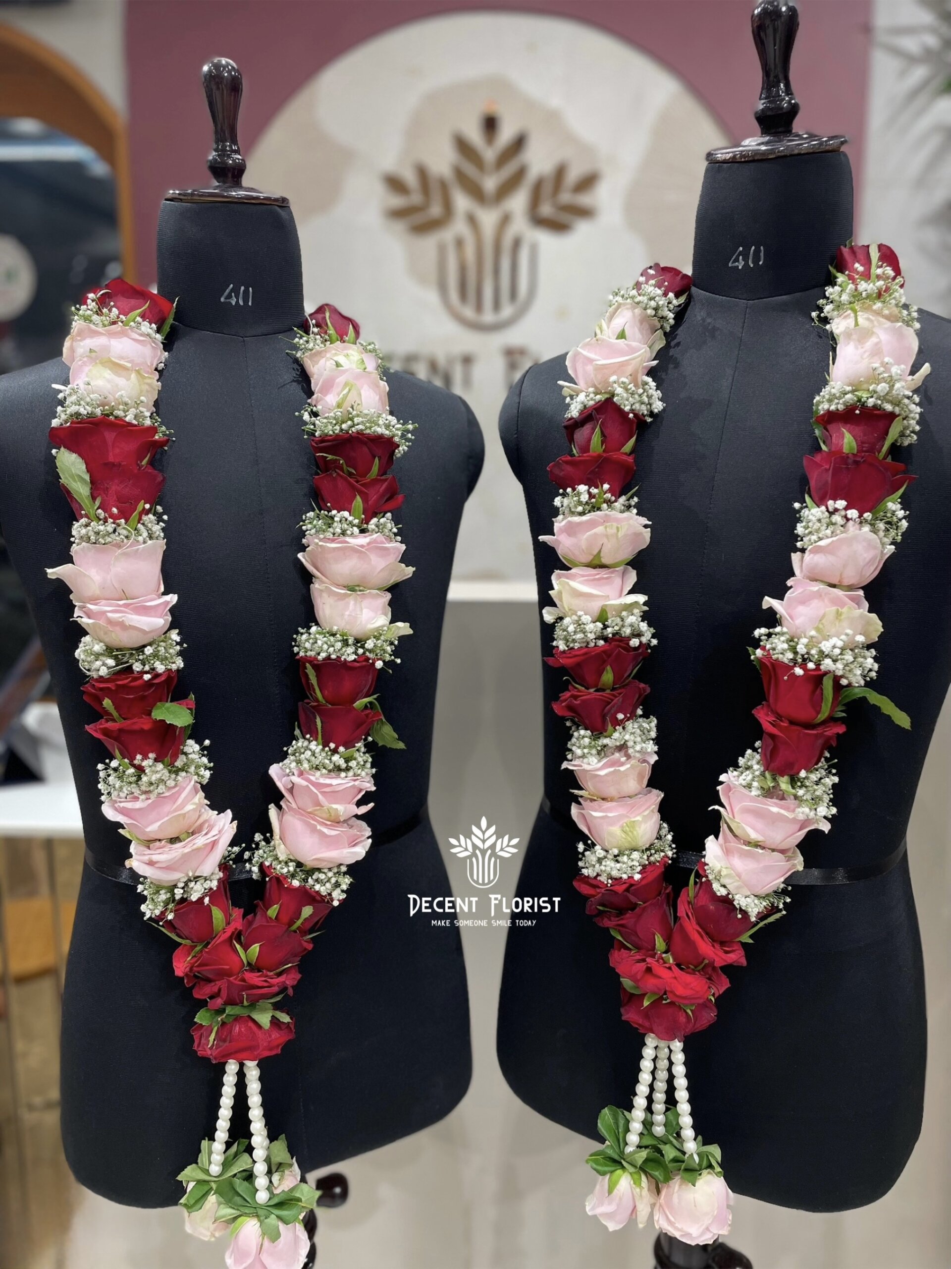 Celebrate your wedding rituals with our beautifully handcrafted marriage garland by Decent Florist.Designed using fresh red roses, sweet pink roses, and delicate baby’s breath, it reflects love and elegance.Each flower is carefully arranged to create a perfect balance of color, fragrance, and beauty.Ideal for varmala ceremony, adding a romantic and graceful touch to your special moment.The combination of vibrant red and soft pink symbolizes deep love and new beginnings.Made with fresh, high-quality flowers to ensure a premium and long-lasting look.Make your big day even more memorable with this timeless floral creation.