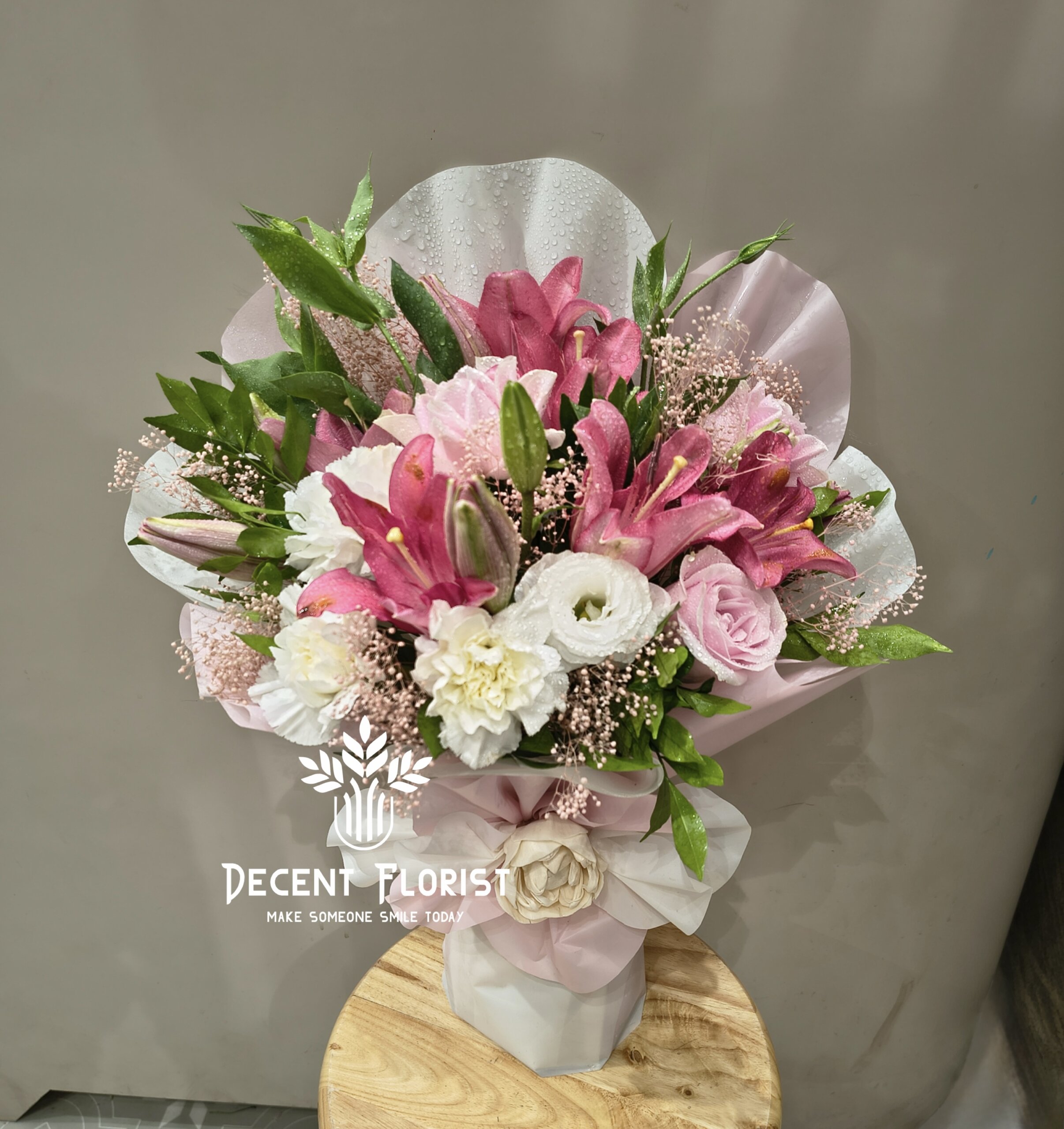 A beautiful fusion of pink lilies, pink roses, white carnations, astroma, and baby’s breath. Gentle colors and fresh blooms make this bouquet ideal for any celebration or thoughtful gesture. Made with love by Decent Florist.